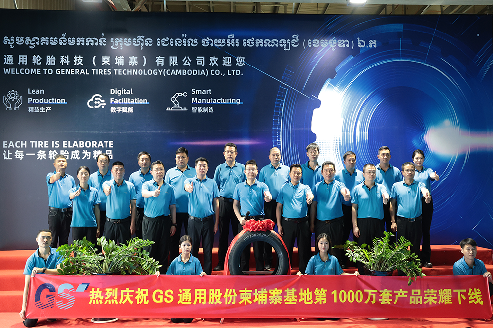 5月6日,通用股份柬埔寨基地迎來歷史性時刻。在半鋼硫化車間內,千里馬品牌275 55R20 PREVAIL H T輪胎緩緩誕生,標志著基地第1000萬條輪