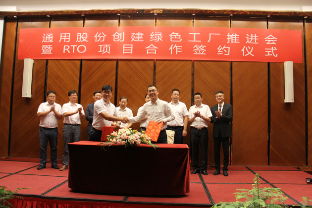 8月29日,通用股份創建綠色工廠推進會暨RTO項目合作簽約儀式舉行,通用股份與韓國大洋環境株式會社正式簽署項目合作協議,雙方就RTO