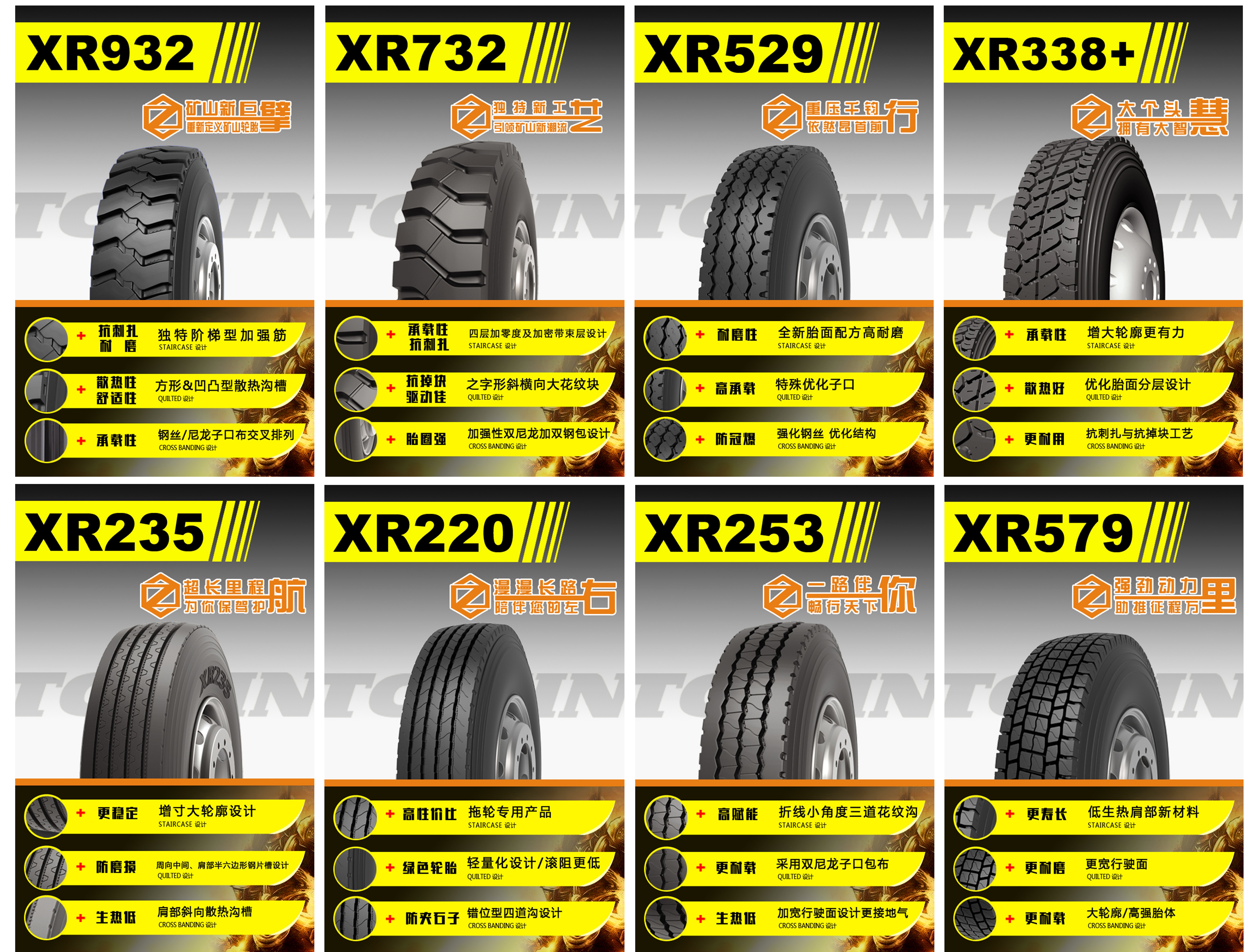 XR932具備獨特的階梯型加強筋設計,輪胎更抗刺扎、更耐磨,使用壽命更長,方形&凹凸型散熱溝槽,有效增強輪胎散熱性、舒適性,通過優化鋼絲/尼龍子口布交叉排列,使輪胎具有卓越的承載性能。