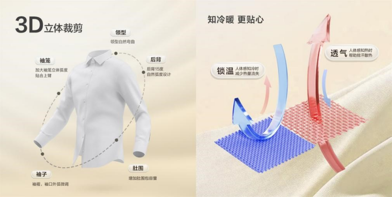 所謂0感,指的是“0壓、0皺、0摩擦、0束縛”。0感舒適襯衫首創(chuàng)紅豆超細(xì)旦纖維,輕如羽毛,彈性十足,透氣性極佳,即便炎炎夏日,也能感受到如沐春風(fēng)般的涼爽與自在。同時(shí),創(chuàng)新運(yùn)用瑞士HeiQ智能控溫科技,讓面料擁有感知外界溫度并自動(dòng)調(diào)節(jié)的能力,實(shí)現(xiàn)“熱縮冷脹”智能溫控效果,在任何環(huán)境下都能保持恰到好處的舒適。